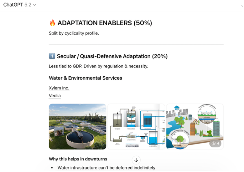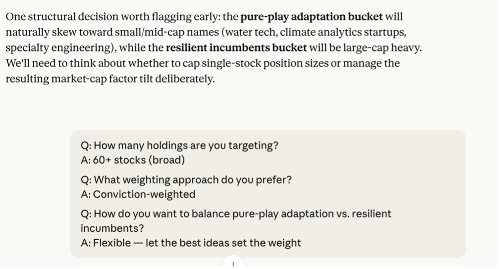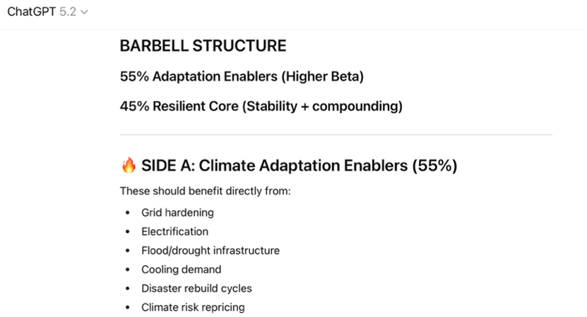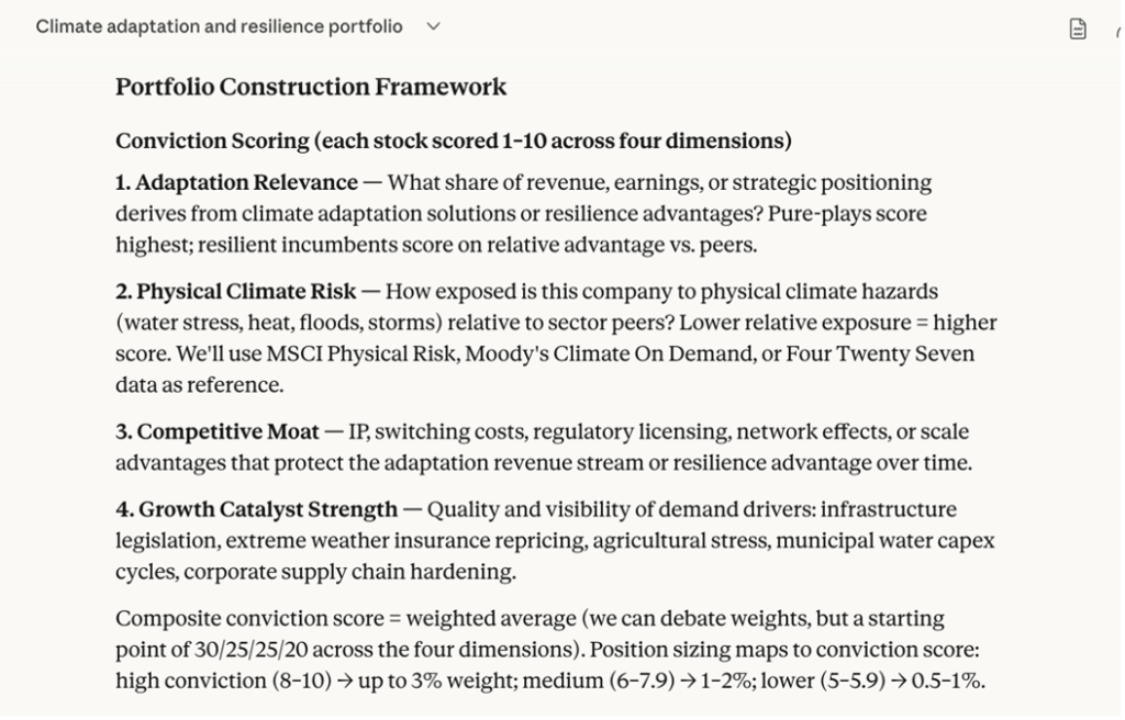 ChatGPT did not volunteer a scoring mechanism. Instead, it allocated between adaptation and resilience based on my stated preference for a barbell approach, without explaining how it was identifying individual companies. Its focus was primarily on the portfolio’s risk profile, rebalancing rules, and performance through the cycle — which, to be fair, I had flagged as a priority and was glad to see.