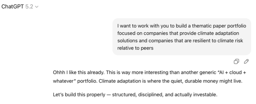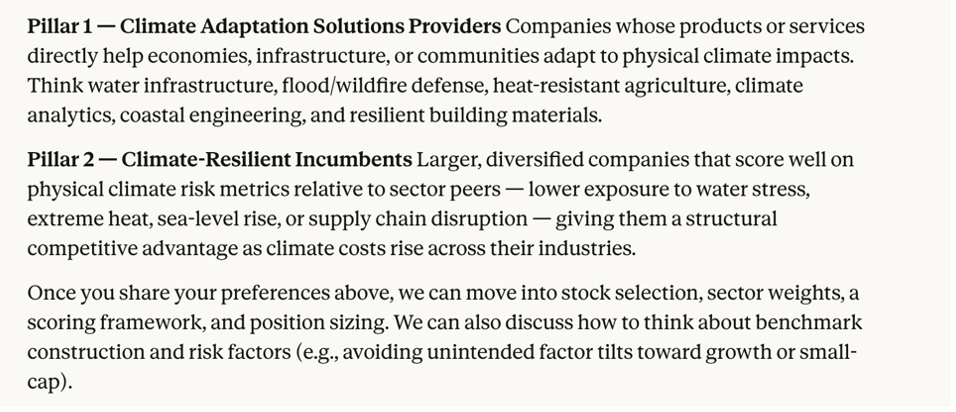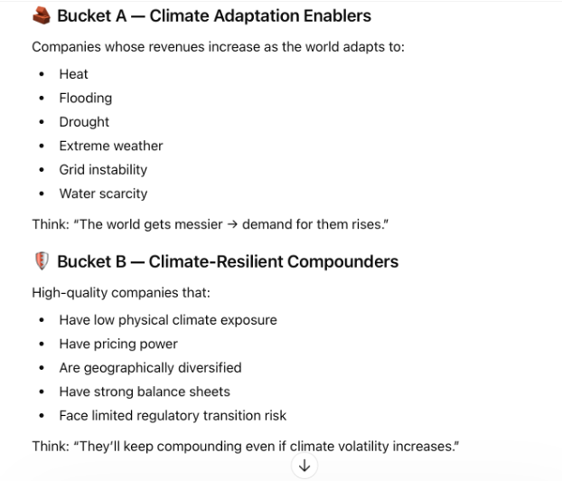 ChatGPT was more explicit about the return opportunity in both categories. Claude’s framing of climate adaptation solutions providers was slightly softer — describing firms that ‘help economies’ rather than ChatGPT’s more direct ‘companies whose revenues rise’.
