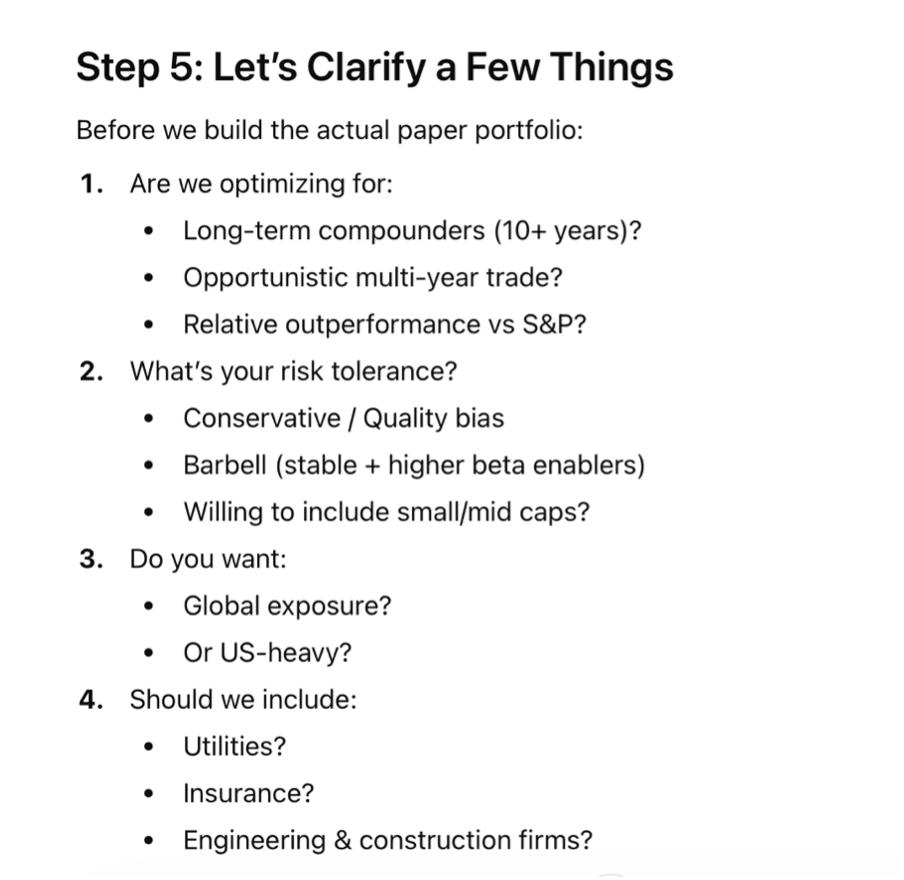 ChatGPT, by contrast, laid out five sequential steps for building the portfolio — with portfolio preferences appearing as step five. Both tools asked similar questions, but Claude was more inclined to explain its reasoning and flag potential nuances or limitations arising from my answers.